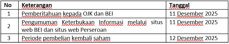 Pelaksanaan pembelian kembali saham akan dilaksanaan dalam jangka waktu 3 (tiga) bulan setelah tanggal penyampaian Keterbukaan Informasi yaitu tanggal 12 Desember 2025 sampai dengan 12 Maret 2026. Perseroan dapat menghentikan pembelian kembali dalam hal terdapat kondisi-kondisi di bawah ini yang terpenuhi:
