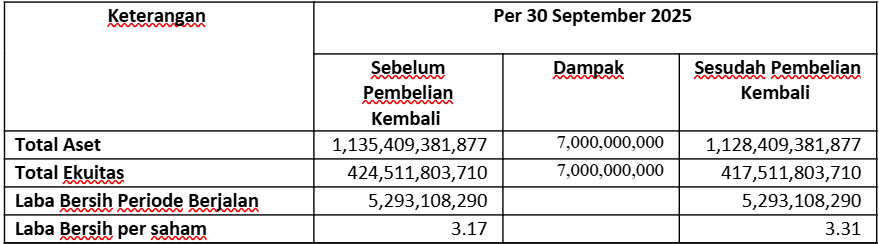 Berikut adalah proforma laba per saham Perseroan berdasarkan laporan keuangan Perseroan per periode 30 September 2025 dengan memperhitungkan nilai pembelian kembali saham sebanyak Rp7.000.000.000,00 (tujuh miliar Rupiah)